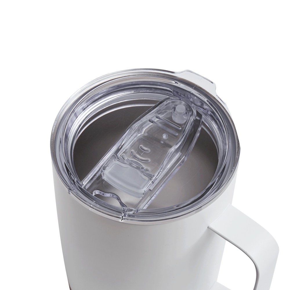 Dvoustěnný vakuový hrnek na pití, uvnitř i vně z nerezové oceli, s korkovým dnem a praktickým uchem, plastové víko se silikonovým těsněním a integrovaným posuvným otvorem na pití, objem cca 350 ml, udrží teplé nápoje cca 4 hodiny a studené až 8 hodin, baleno v krabičce. Rozměry: O8,5 x 13 cm