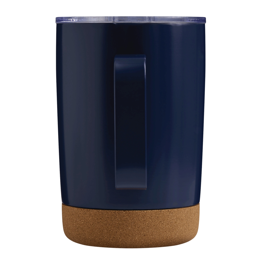 Dvoustěnný vakuový hrnek na pití, uvnitř i vně z nerezové oceli, s korkovým dnem a praktickým uchem, plastové víko se silikonovým těsněním a integrovaným posuvným otvorem na pití, objem cca 350 ml, udrží teplé nápoje cca 4 hodiny a studené až 8 hodin, baleno v krabičce. Rozměry: O8,5 x 13 cm