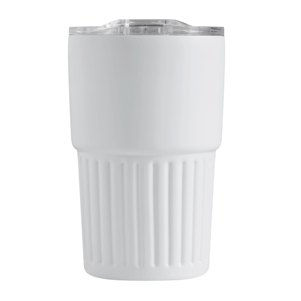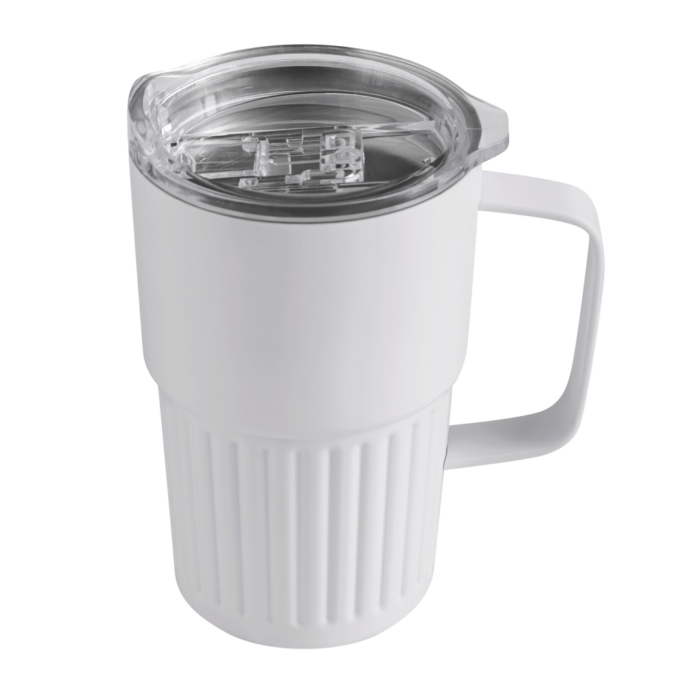 Dvoustěnný vakuový hrnek na nápoje, vnitřek z recyklované nerezové oceli, vnější strana z nerezové oceli, praktická rukojeť, plastové víko se silikonovým těsněním a integrovaným posuvným otvorem na pití, objem cca 450 ml, udrží teplé nápoje cca 4 hodiny a studené až 8 hodin, baleno v krabičce. Rozměry: O8,7 x 14 cm