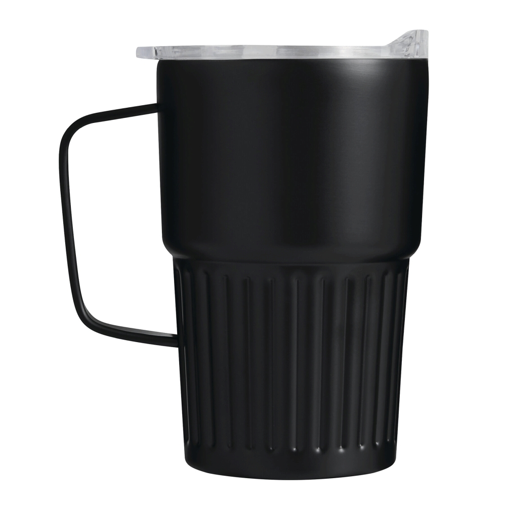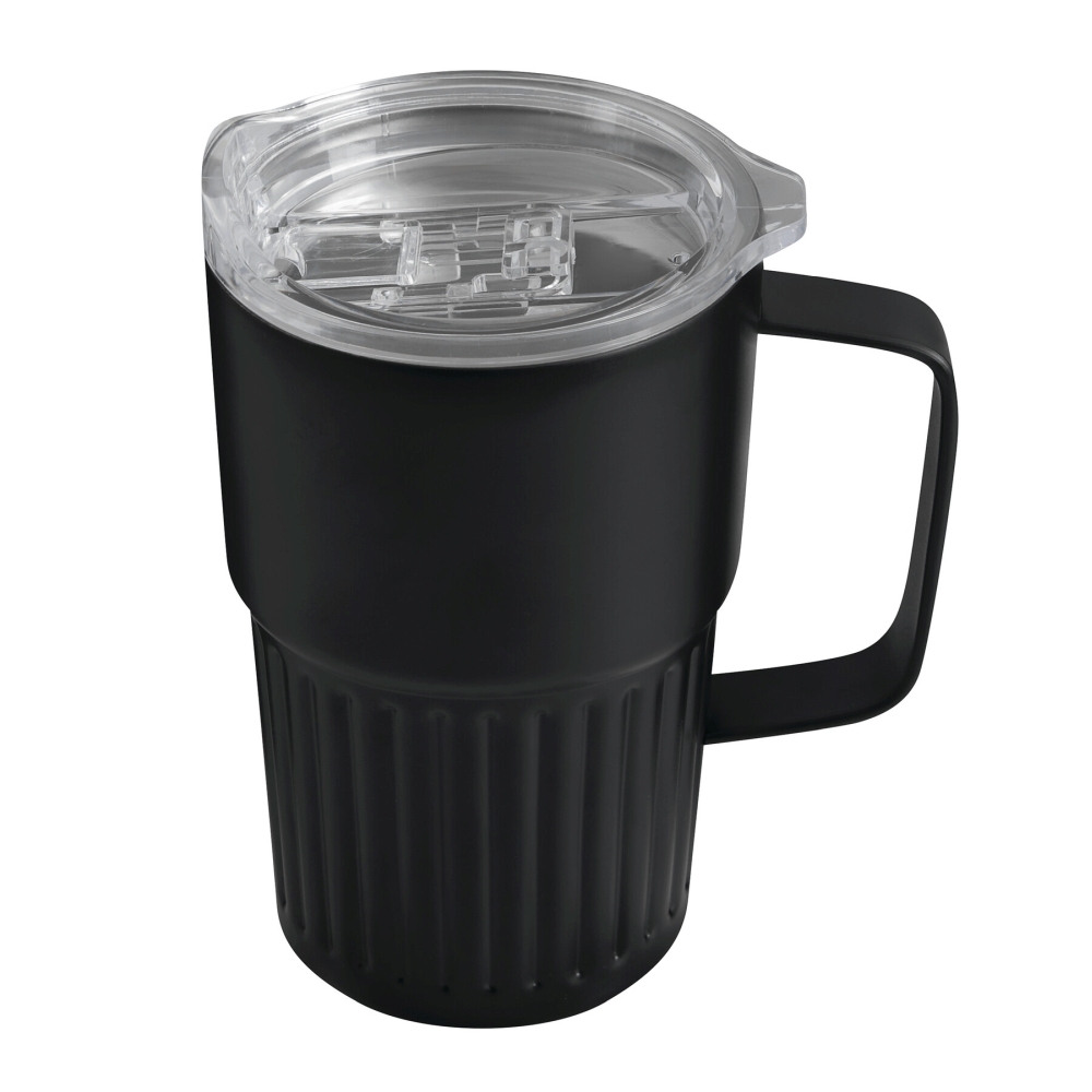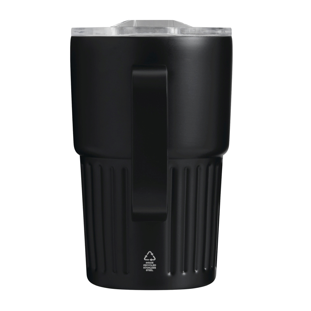 Dvoustěnný vakuový hrnek na nápoje, vnitřek z recyklované nerezové oceli, vnější strana z nerezové oceli, praktická rukojeť, plastové víko se silikonovým těsněním a integrovaným posuvným otvorem na pití, objem cca 450 ml, udrží teplé nápoje cca 4 hodiny a studené až 8 hodin, baleno v krabičce. Rozměry: O8,7 x 14 cm