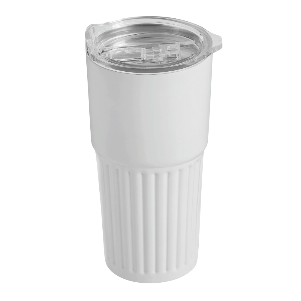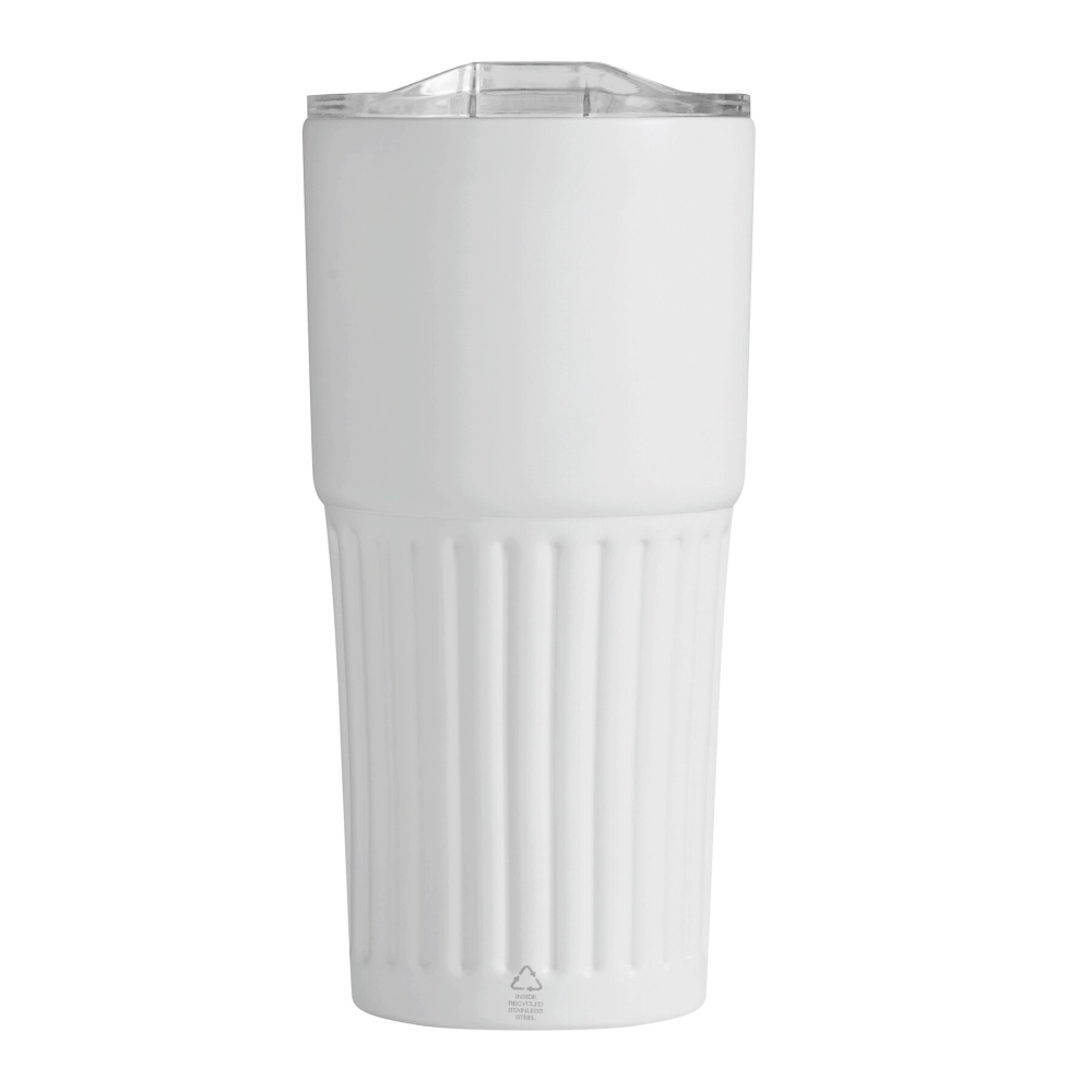 Dvoustěnný vakuový hrnek na pití, vnitřek z recyklované nerezové oceli, vnější strana z nerezové oceli, plastové víko se silikonovým těsněním a integrovaným posuvným otvorem na pití, objem cca 600 ml, udrží teplé nápoje cca 4 hodiny a studené až 8 hodin, baleno v krabičce. Rozměry: O8,7 x 18 cm