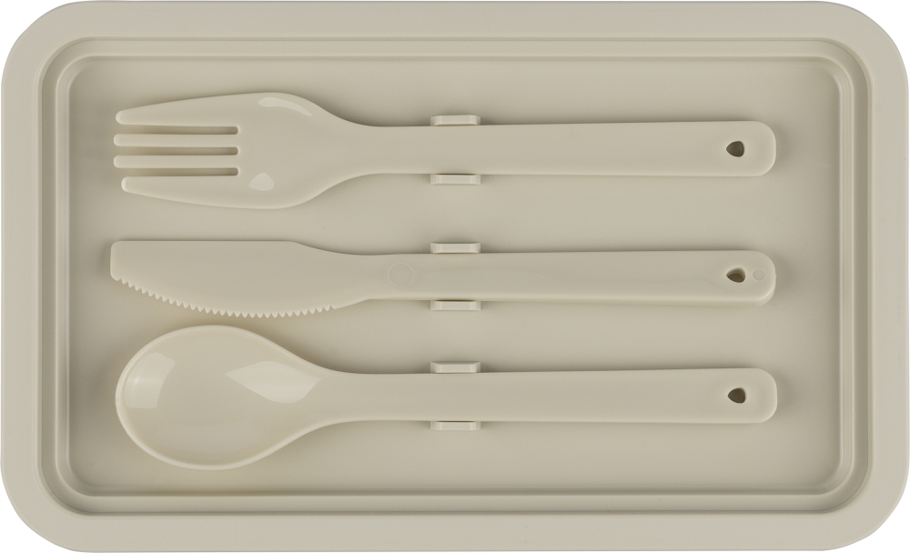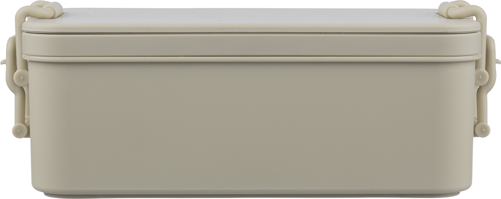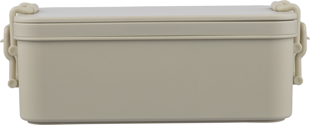 Dvouvrstvý PP svačinový box s klipem a PP víkem. Má menší spodní přihrádku, která se dá stohovat do horní pro úsporu místa. Včetně mezivrstvy se sadou 3 příborů. Objem 2 200 ml. Baleno ve velkém. Rozměry: 7,7 cm x 23 cm