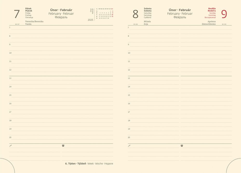 Jde o moderní typ diářů s vyměnitelnými deskami a variabilním obsahem. Praktické desky jsou vybaveny poutkem na tužku, magnetickou uzavírací klopou a jejich okraj zdobí obšití nití. Desky je možno použít opakovaně pro zápisníky i diáře, proto neobsahují ražbu letopočtu. Kvalitní koženka umožňuje dosáhnout vynikajících výsledků ražbou bez fólie. Diář obsahuje: osobní údaje, plánovač dovolené (měsíční přehled), plánovací kalendář, telefonní předvolby, státní svátky České a Slovenské republiky, mezinárodní svátky, roční výhled, denní layout, adresář, mapa Evropy a České a Slovenské republiky. Rozměry: 14,3 x 20,5 cm.