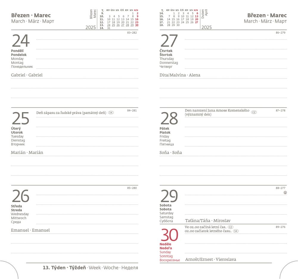 Desky diáře jsou zhotoveny z univerzálního matného materiálu na bázi zušlechtěného papíru, který je bez struktury a tím neruší vzhled samotného produktu. Doporučujeme tamponový tisk. Diář obsahuje: osobní údaje, plánovač dovolené (měsíční přehled), plánovací kalendář, mezinárodní svátky, roční výhled, týdenní layout, adresář. Rozměry: 8 x 15 cm.