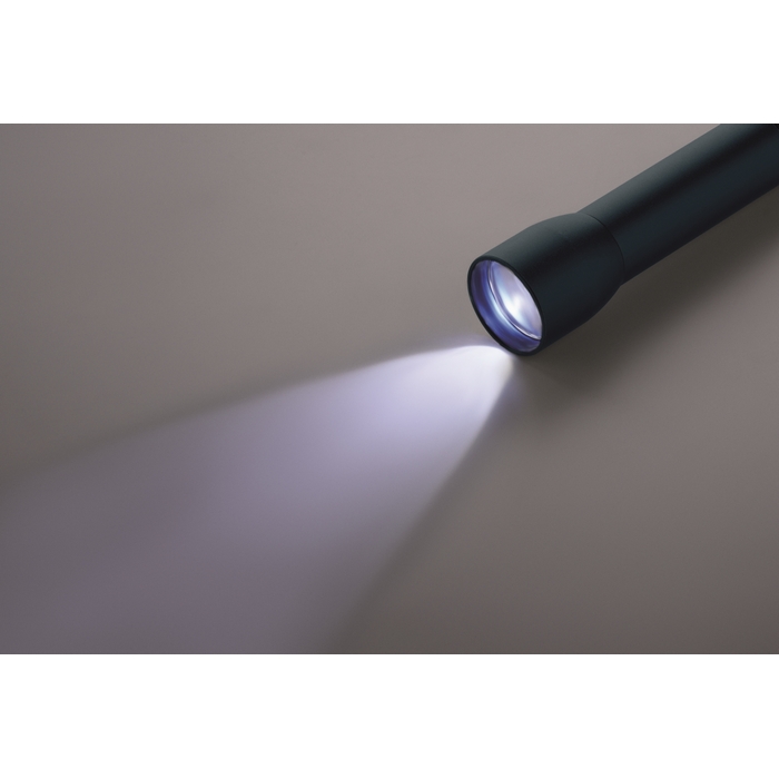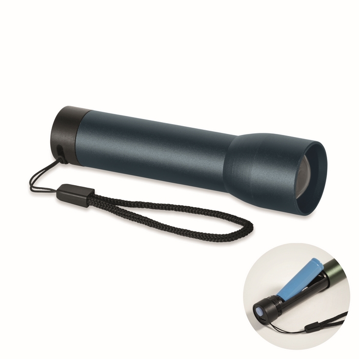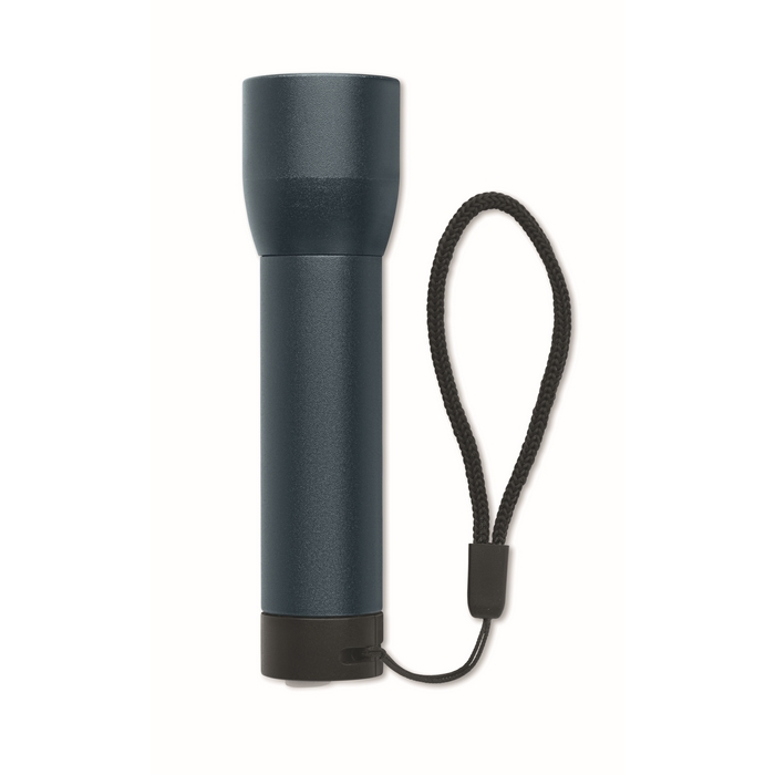Dobíjecí svítilna z recyklovaného hliníku s několika nastaveními světla a zoom funkcí. Vyměnitelná lithiová baterie 14500. Výkonná a odolná pro každodenní použití. Rozměry: 2.5 x 2.5 x 10 cm