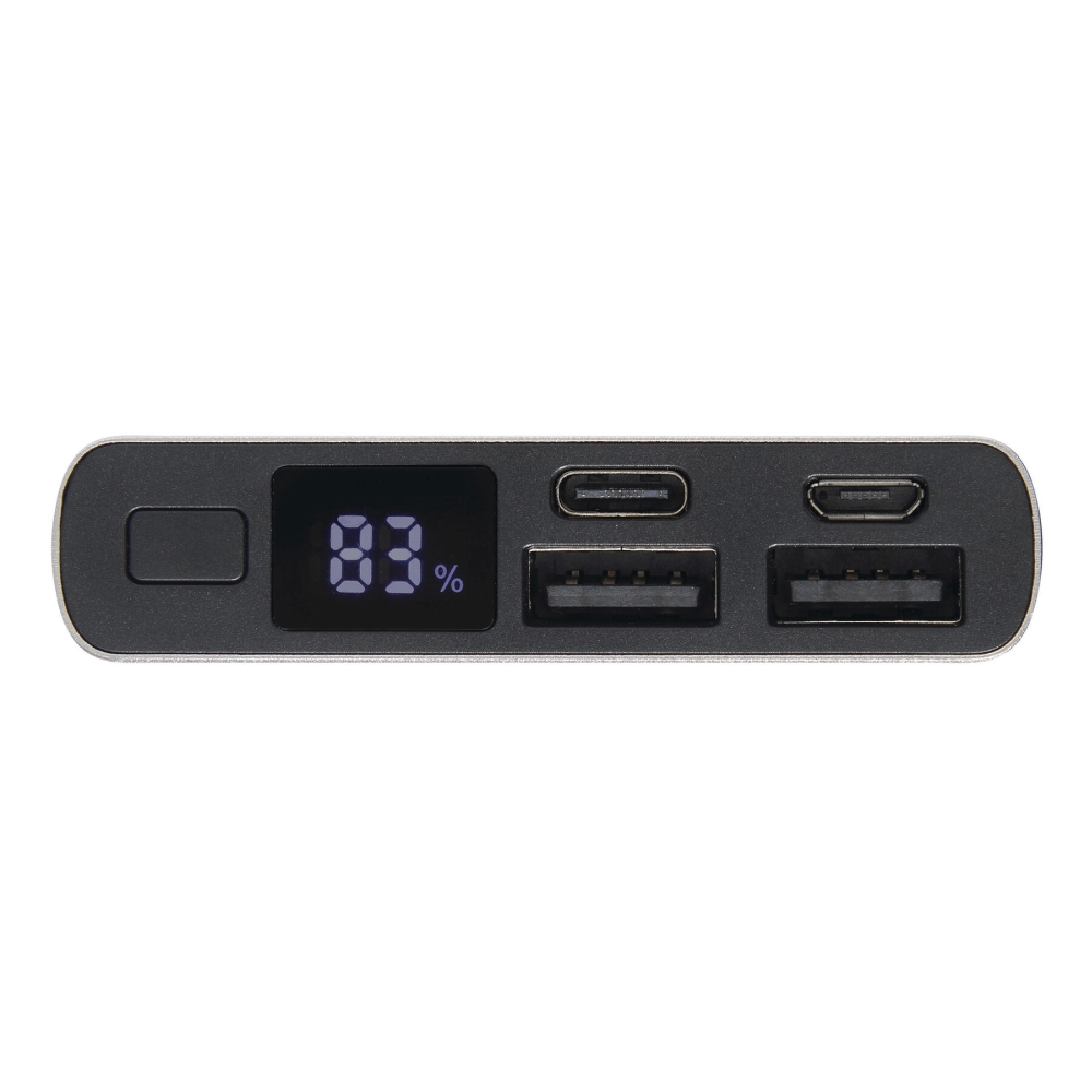 Powerbanka vhodná pro chytré telefony a zařízení připojená přes USB, včetně nabíjecího kabelu USB s konektorem USB typu C (délka: cca 30 cm), s indikátorem stavu baterie v procentech, vypínačem, 1 vstupem/výstupem USB typu C, 1 vstupem Micro-USB, 2 výstupy USB typu A, vstup: 5 V/2 A, výstup: 5 V/2 A (max.), kapacita: 10 000 mAh, vysoce výkonná lithiová baterie, baleno v dárkové krabičce. Rozměry: 14,2 x 6,6 x 1,6 cm