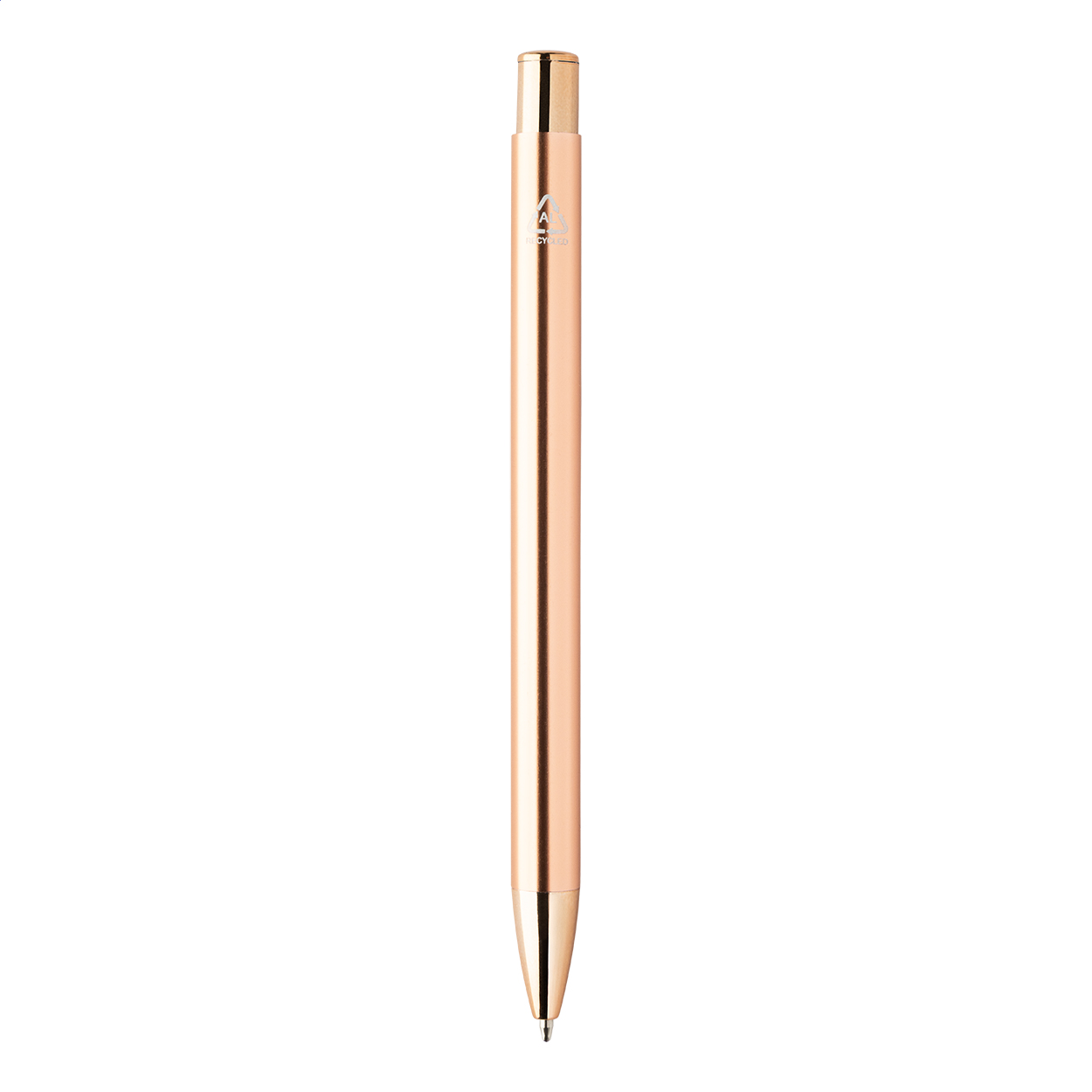 Propiska z recyklovaného hliníku s lesklým kovovým povrchem. S modrou náplní.