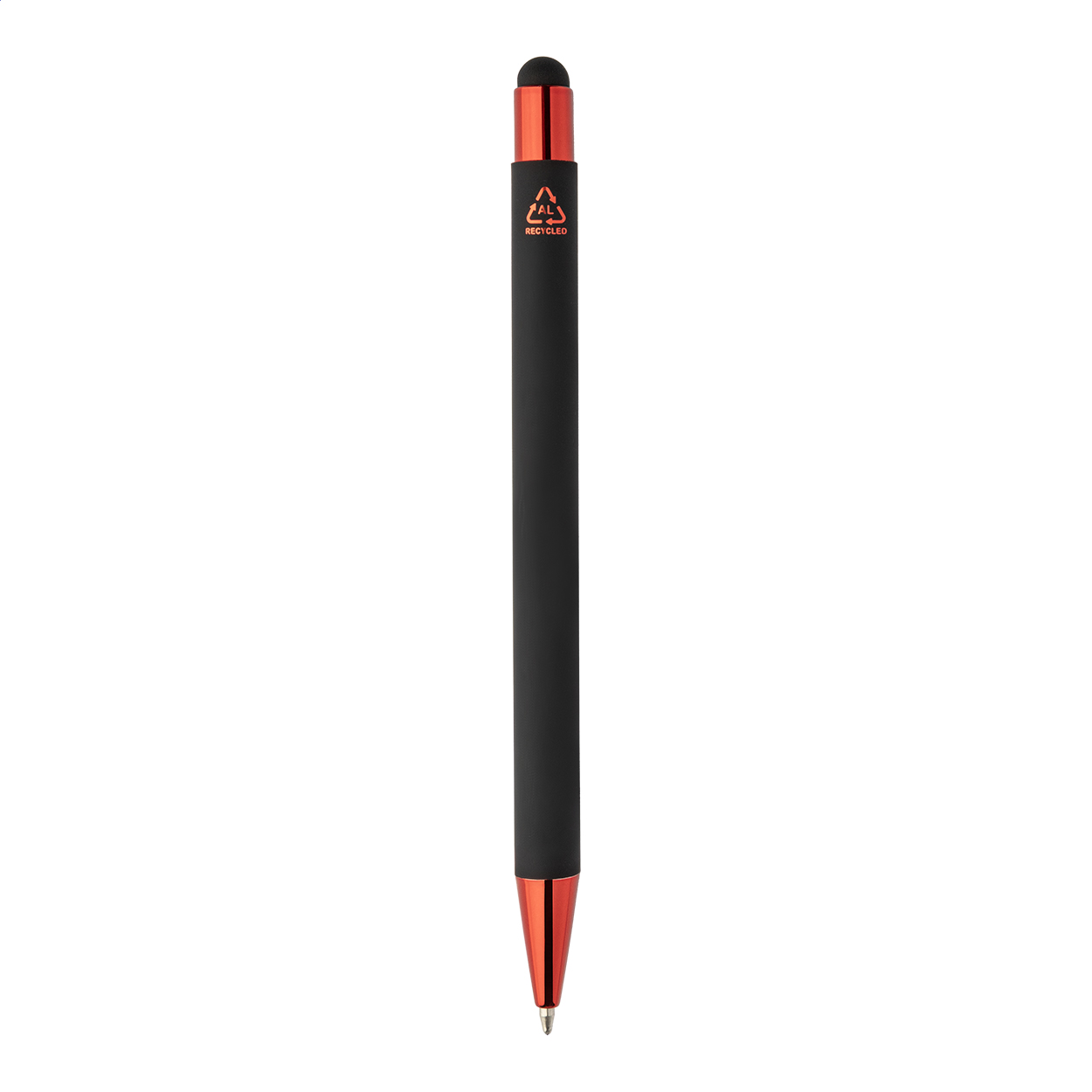 Propiska z recyklovaného hliníku na dotykovou obrazovku, s černým pogumovaným tělem a barevnými lesklými kovovými částmi. Se speciálním povrchem pro zrcadlové gravírování, které ladí s kovovými částmi. S modrou náplní.