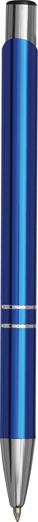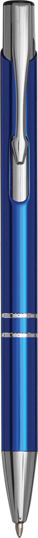Hliníkové kuličkové pero má lesklé kovové tělo a klip, velkokapacitní náplň s modrým inkoustem, tlačítkový mechanismus. Rozměr: 13,7 cm