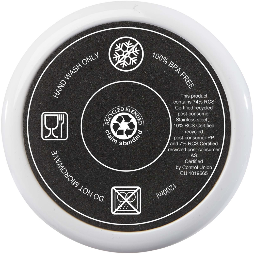 Hrnek se vyznačuje odolnou konstrukcí s dvojitou stěnou, která udržuje nápoje horké nebo studené v jakémkoli prostředí. Vnitřní stěna hrnku je vyrobena z recyklovaného plastu, vnější stěna z recyklované nerezové oceli. Hrnek o objemu 1200 ml nabízí stylový způsob, jak zůstat hydratovaný po celý den. Má přítlačné víčko odolné proti vyšplíchnutí se dvěma otvory a otočným uzávěrem. Dodává se s recyklovaným brčkem potravinářské kvality. Nedoporučujeme mýt v myčce. Rozměry: 13,8 x 26,1 x 10 x O 10 cm