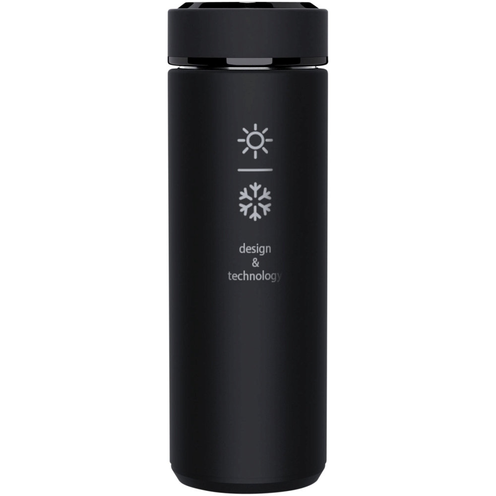 450ml lahvička z nerezové oceli s dvojitou stěnou a teplotním senzorem. Díky systému „Touch & Light“ se na víku láhve zobrazuje teplota nápoje (ve stupních Celsia). Vhodná pro horké i studené nápoje. Dodává se v dárkové krabičce válcového tvaru z recyklovaného papíru. Obsahuje baterii: CR 2450 (3 V). Baterii nelze vyměnit. Teplotu lze zobrazit až 2000×. Rozměry: 23 x O 6,3 cm