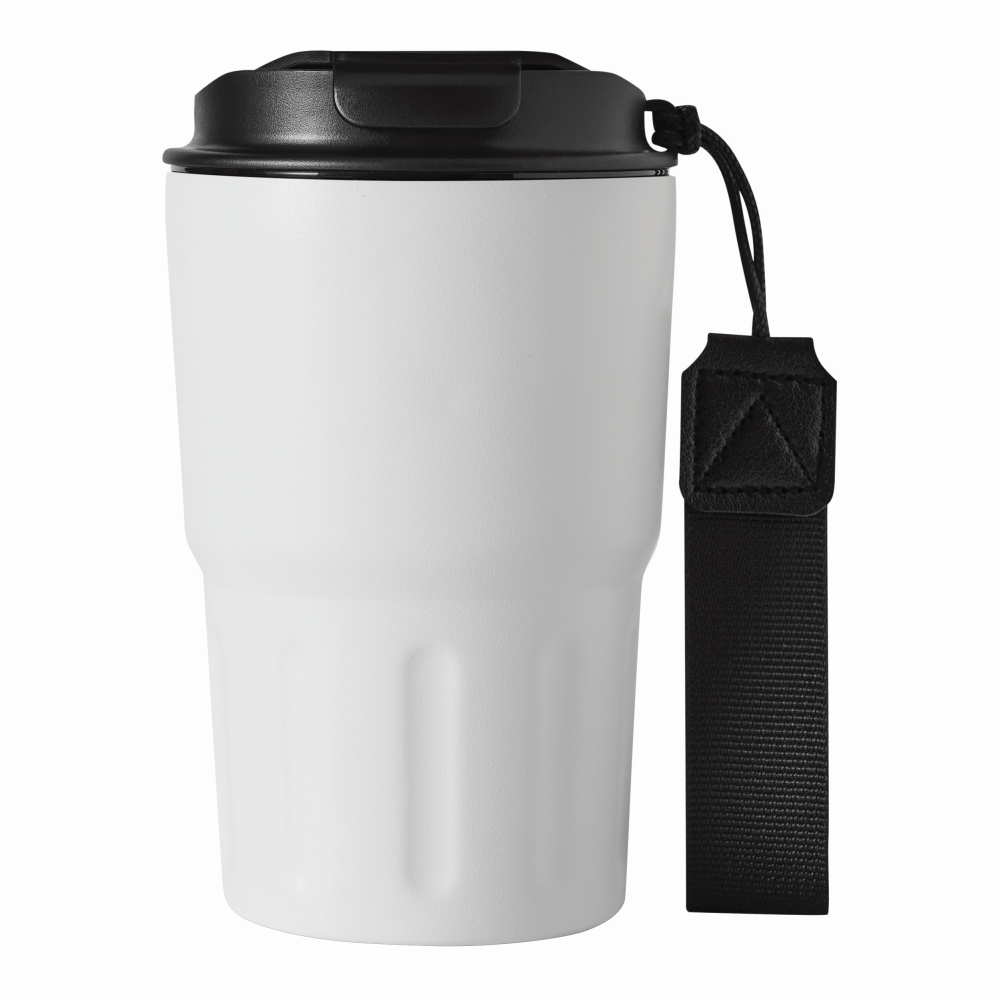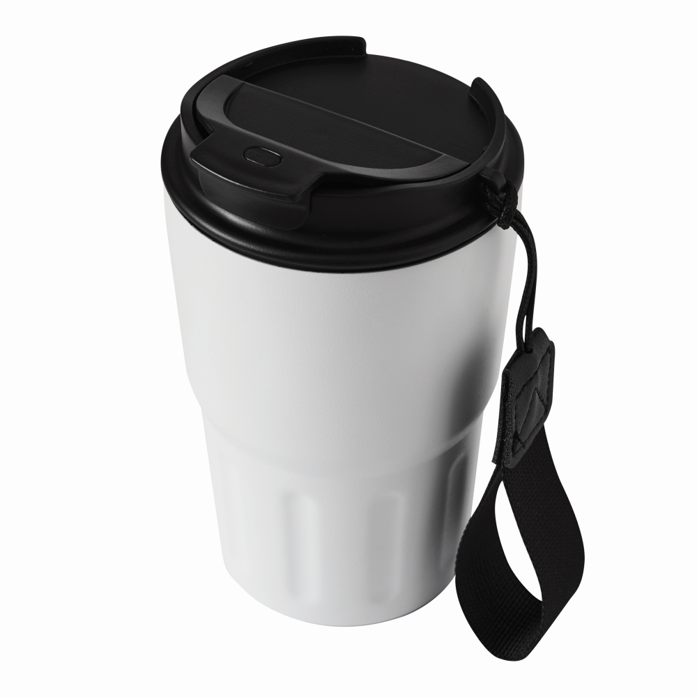 Izolovaný hrnek, dvoustěnný: uvnitř i vně z nerezové oceli, matný práškový lak, plastové víčko s bezpečným šroubovacím uzávěrem, silikonové těsnění a integrovaný otvor na pití, kapacita cca. 400 ml, poutko na zápěstí z recyklovaného plastu. Rozměry: O8,8 x 14,7 cm