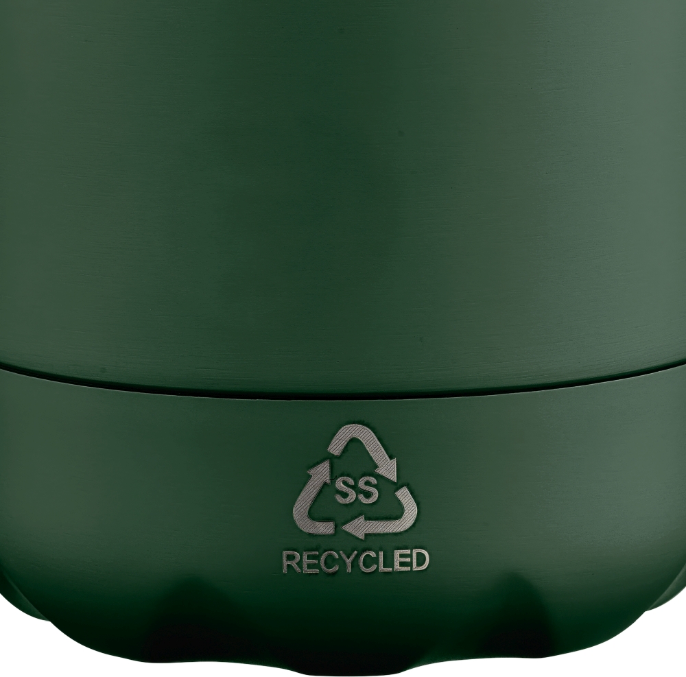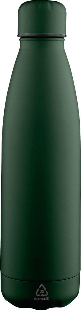 Jednostěnná láhev na pití z recyklované nerezové oceli o objemu 700 ml, vhodná pro studené nápoje, udrží je chladné 3 až 4 hodiny. Vnitřní vrstva z nerezové oceli zajišťuje vynikající odolnost, odolnost proti korozi a bezpečný kontakt s potravinami a nápoji. Matná barva s odpovídajícím šroubovacím víčkem a dnem. Na přední straně je vyryto recyklované logo. Baleno jednotlivě v hnědé kartonové krabici. Rozměry: 7 x 26 cm