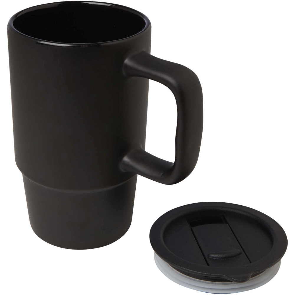 Keramický hrnek s nadměrně velkým uchem pro snadné přenášení a plastovým víčkem odolným proti rozlití pro pohodlné nošení na cestách. Vnější povrch má stylový matný povrch a láhev je u všech metod tisku vhodná do myčky na nádobí. Dodává se v dárkové krabičce z recyklované lepenky. Objemová kapacita: 450 ml. Rozměry: 12,6 x 14,1 x 8,2 x O 8,2 cm
