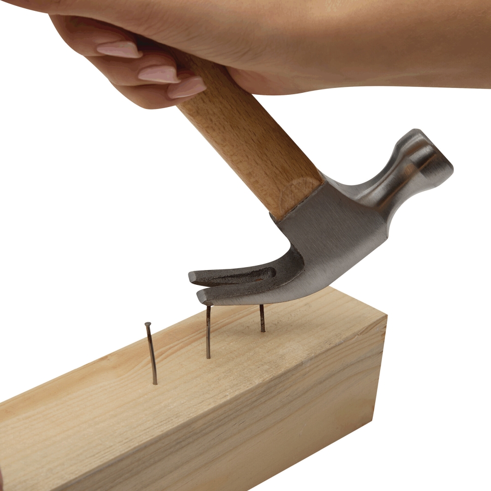 Kladivo s drápem na odstraňování hřebíků, hlava z oceli, rukojeť z bukového dřeva. Rozměry: 28,2 cm