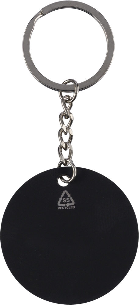 Klíčenka z recyklované nerezové oceli s pogumovaným kovovým kroužkem kulatého tvaru. S gravírovaným logem z recyklovaného materiálu, které po gravírování odhaluje lesklý zrcadlový efekt. Jednotlivě baleno v obálce z kraftového papíru. Rozměry: 3,2 cm x 0,5 cm x 5,2 cm