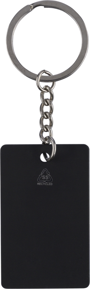 Klíčenka z recyklované nerezové oceli s pogumovaným kovovým kroužkem kulatého tvaru. S gravírovaným logem z recyklovaného materiálu, které po gravírování odhaluje lesklý zrcadlový efekt. Jednotlivě baleno v obálce z kraftového papíru. Rozměry: 3,2 cm x 0,5 cm x 5,2 cm