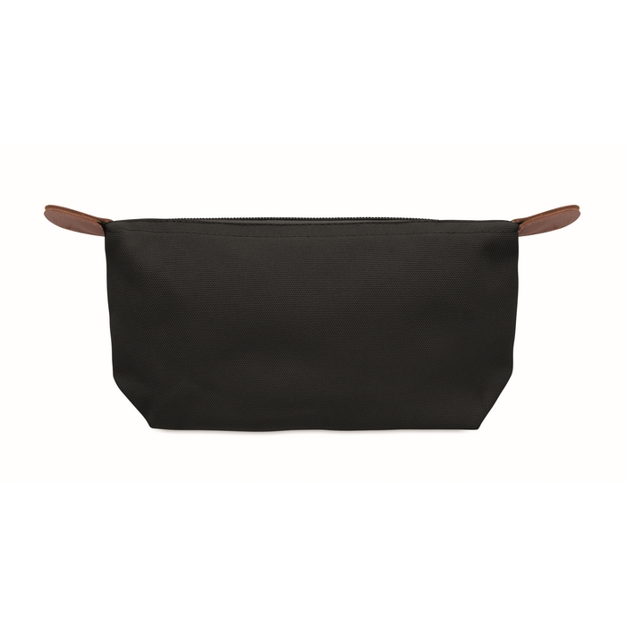 Kosmetická taštička z polyesteru 600D RPET s horním zapínáním na zip a hnědým PU detailem. Rozměry: 20 x 5.5 x 12 cm