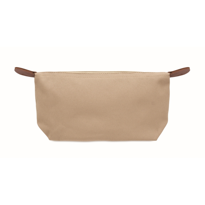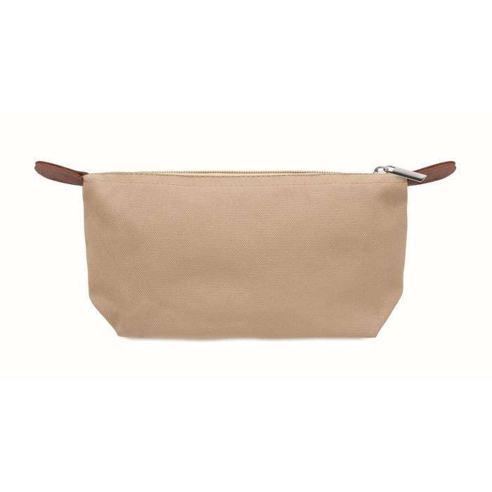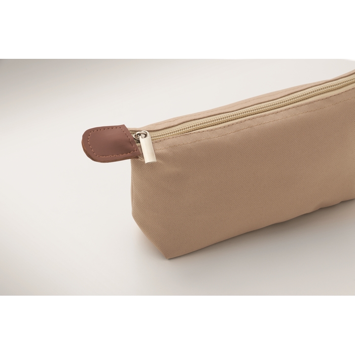 Kosmetická taštička z polyesteru 600D RPET s horním zapínáním na zip a hnědým PU detailem. Rozměry: 20 x 5.5 x 12 cm