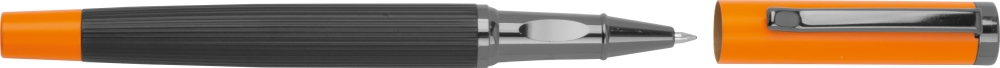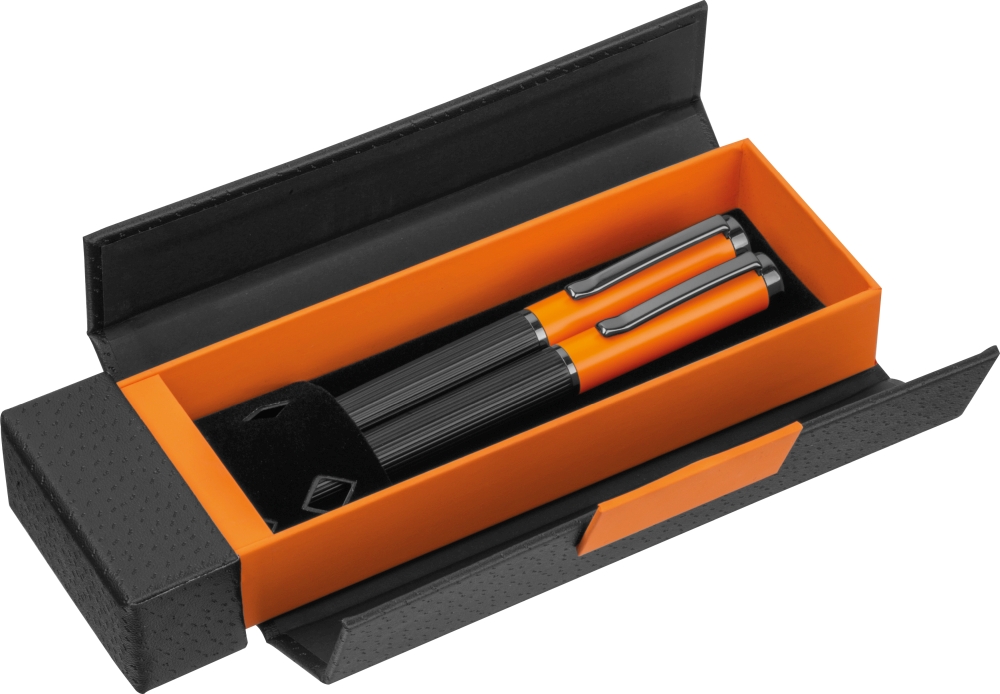 Kovová psací sada s modrou náplní, skládá se z kuličkového pera a rolleru v barevně skladěném zaklapávacím pouzdře. Rozměry: 17,8 x 5,9 x 2,8 cm