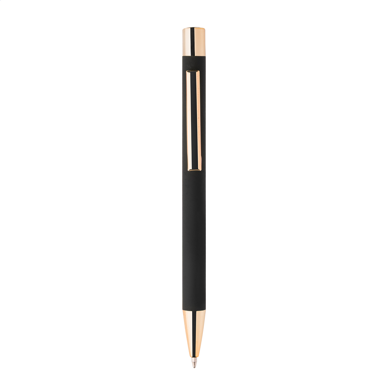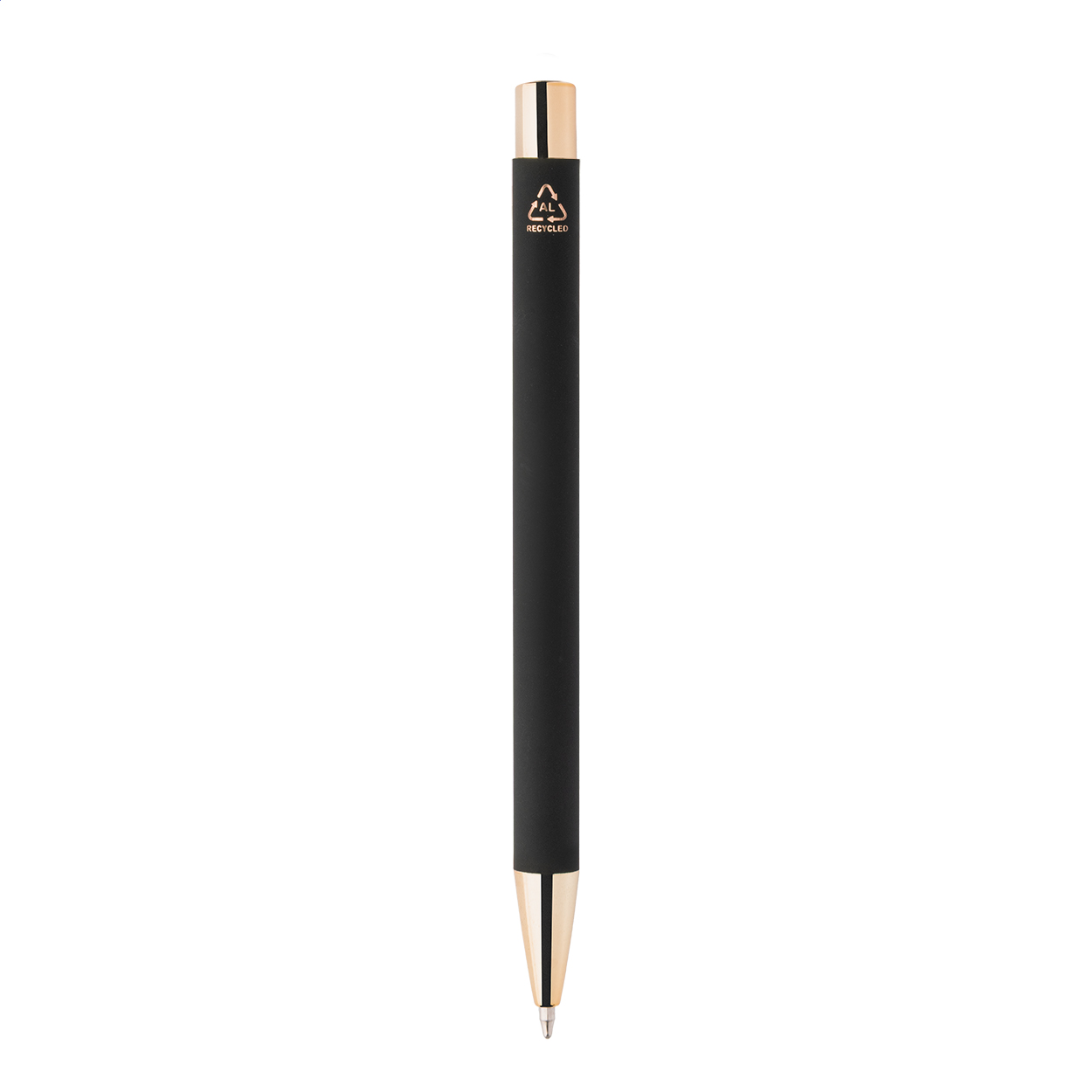 Kuličkové pero z recyklovaného hliníku s černým pogumovaným tělem a barevnými lesklými kovovými částmi. Se speciálním povrchem pro zrcadlové gravírování, které ladí s kovovými částmi. S modrou náplní.