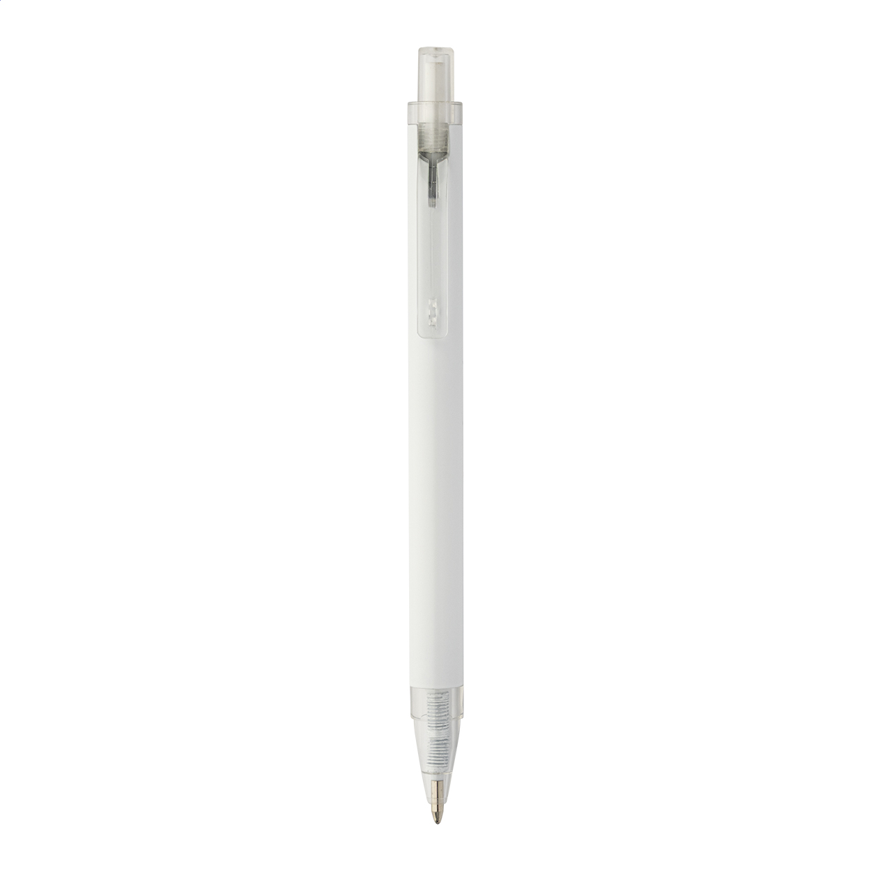 Kuličkové pero z recyklovaného hliníku s matným tělem a průhlednými RPET částmi. S modrou náplní.
