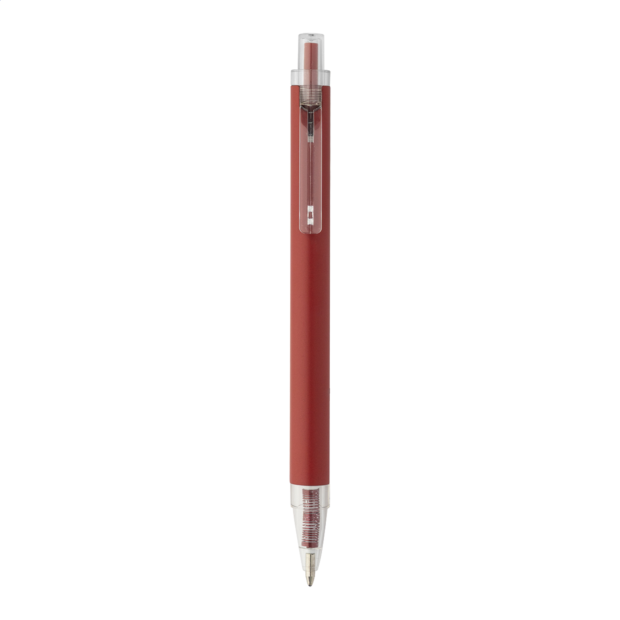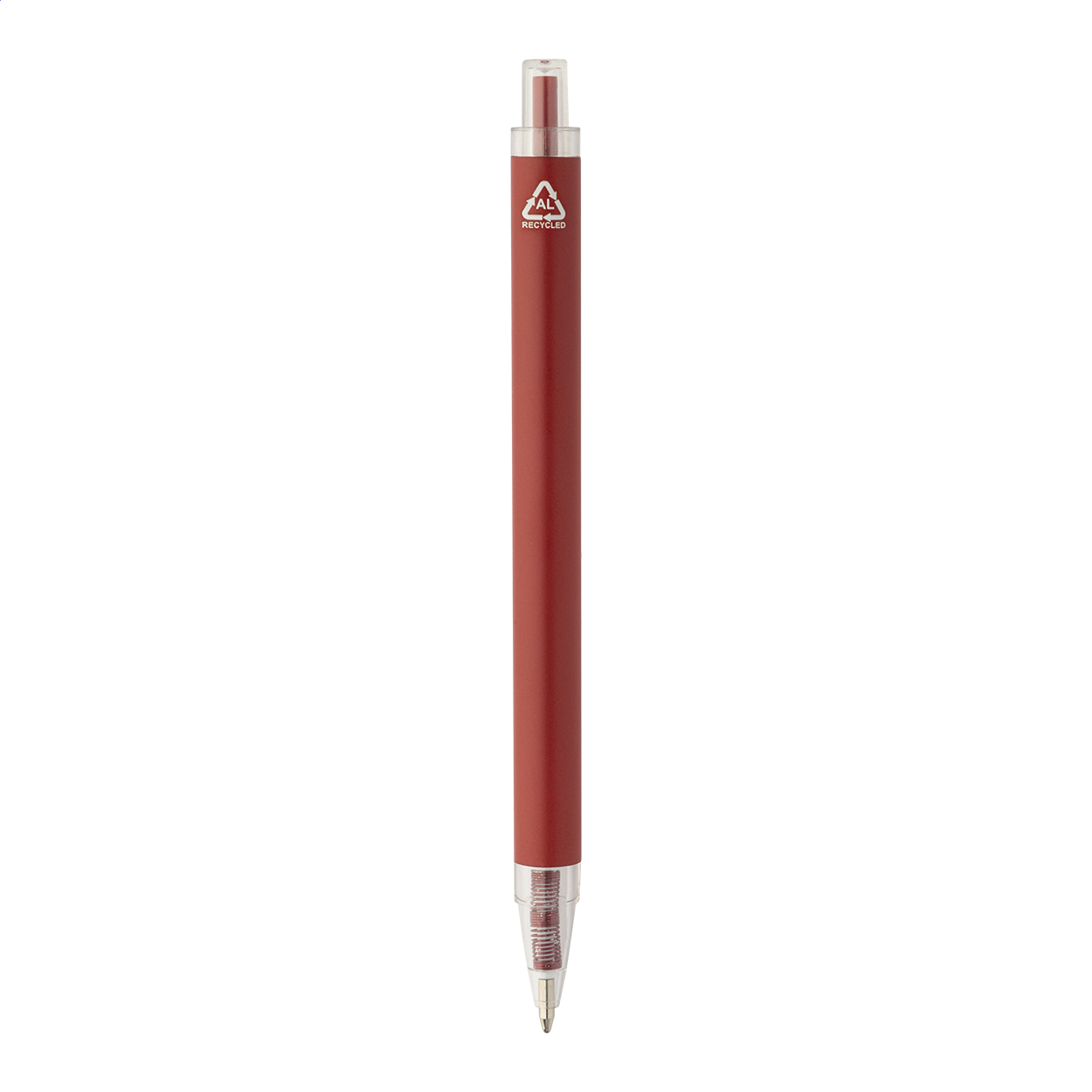 Kuličkové pero z recyklovaného hliníku s matným tělem a průhlednými RPET částmi. S modrou náplní.