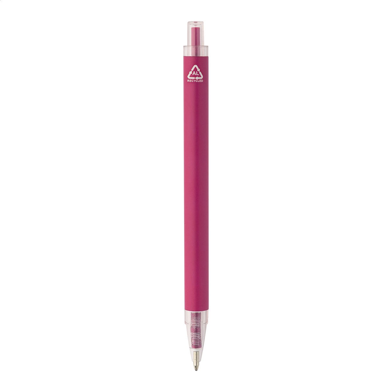 Kuličkové pero z recyklovaného hliníku s matným tělem a průhlednými RPET částmi. S modrou náplní.