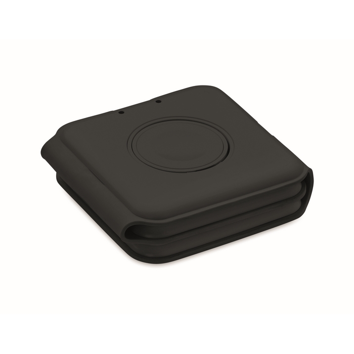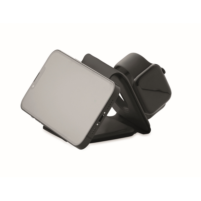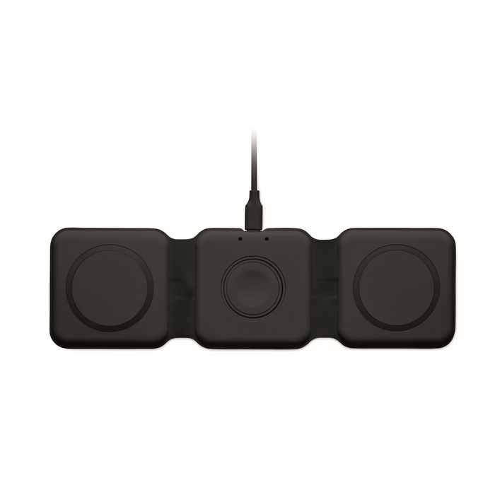 Skládací nabíjecí stanice 3v1 z ABS. 3 nabíjecí plochy. Vstup: 2v1 typ C a typ A. Rozměry: 25 x 7.5 x 0.8 cm