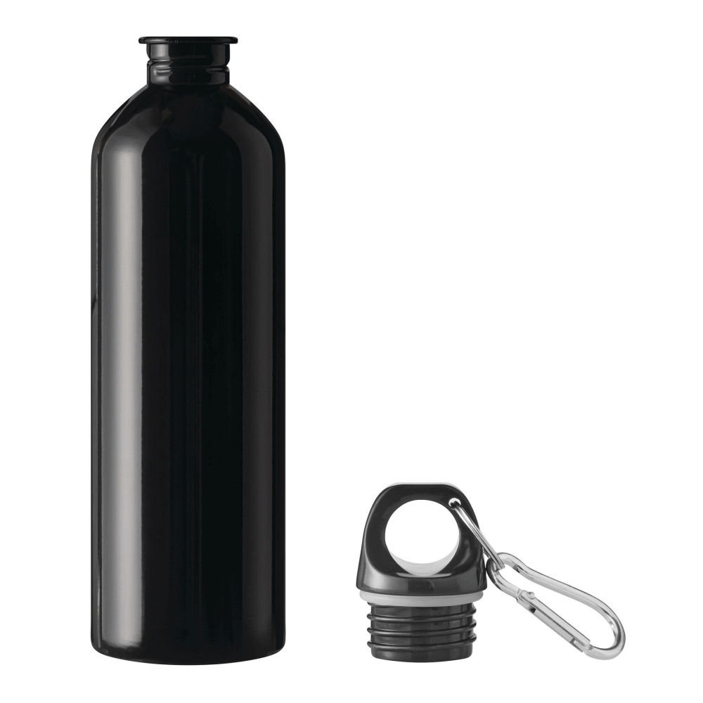 Láhev na pití, jednostěnná: vyrobena z recyklované nerezové oceli, bezpečnostní černý šroubovací uzávěr z plastu, silikonové těsnění, rukojeť na přenášení, kroužek na klíče a karabina (karabina NENÍ vhodná pro lezení), objem cca 750 ml. Rozměry: O7,3 x 26 cm