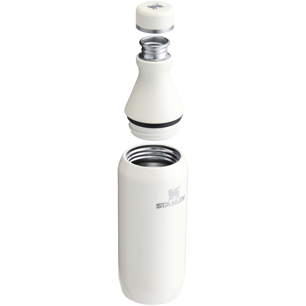 Láhev na vodu o objemu 350 ml je navržena pro celodenní hydrataci, kombinuje pohodlí a výkon. Vyrobena z 90 % z recyklované nerezové oceli. Má dvoudílné víčko – jedno pro snadné popíjení a druhé pro přidání ledu a bezproblémové čištění. Hrdlo je vyrobeno z jednostěnné nerezové oceli s plastovou přírubou se závitem a bezpečnostním tlakovým těsněním, aby se zabránilo úniku tekutin. Tělo má dvojitou vakuovou izolaci, která zajišťuje, že nápoje zůstanou v dokonalé teplotě po celé hodiny. Odolná a promyšleně navržená, tato láhev je ideální pro osvěžení, ať vás den zavede kamkoli. Rozměry: 6,55 x 21,9 x 6,55 cm