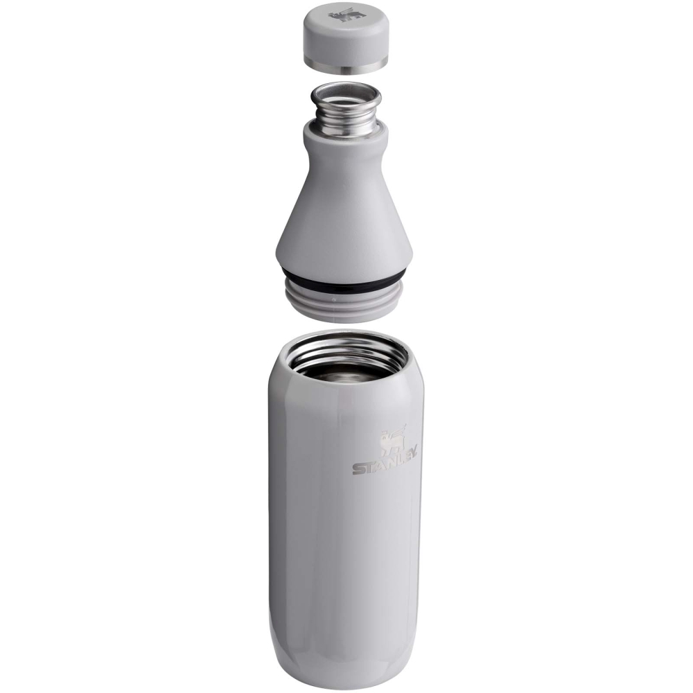 Láhev na vodu o objemu 350 ml je navržena pro celodenní hydrataci, kombinuje pohodlí a výkon. Vyrobena z 90 % z recyklované nerezové oceli. Má dvoudílné víčko – jedno pro snadné popíjení a druhé pro přidání ledu a bezproblémové čištění. Hrdlo je vyrobeno z jednostěnné nerezové oceli s plastovou přírubou se závitem a bezpečnostním tlakovým těsněním, aby se zabránilo úniku tekutin. Tělo má dvojitou vakuovou izolaci, která zajišťuje, že nápoje zůstanou v dokonalé teplotě po celé hodiny. Odolná a promyšleně navržená, tato láhev je ideální pro osvěžení, ať vás den zavede kamkoli. Rozměry: 6,55 x 21,9 x 6,55 cm
