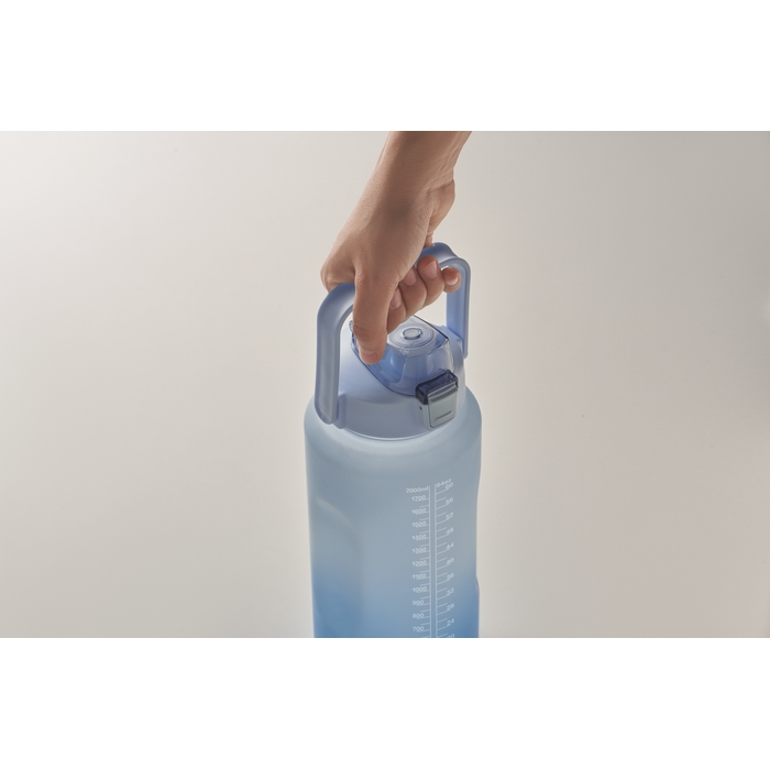 Motivační láhev na vodu z RPET. Víčko s brčkem, které se otevírá jednou rukou. Bezpečnostní zámek a rukojeť. Neteče. Objem: 2000 ml. Rozměry: O11 x 30 cm