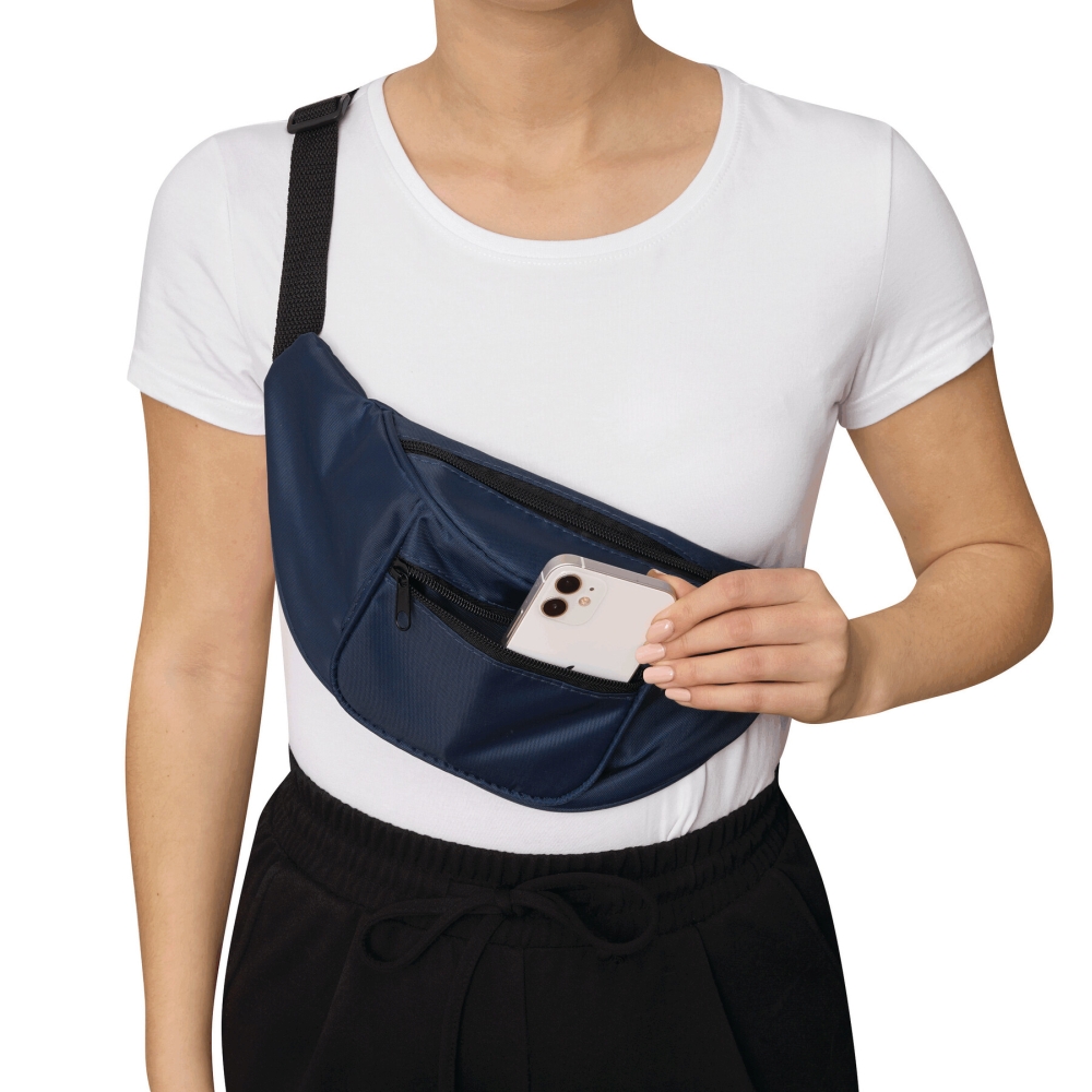 Kapsa na opasek, prostorná hlavní kapsa na zip, 1 přední kapsa na zip, nastavitelný bederní popruh s bočním uvolňováním. Rozměry: 35 x 15 x 7,5 cm