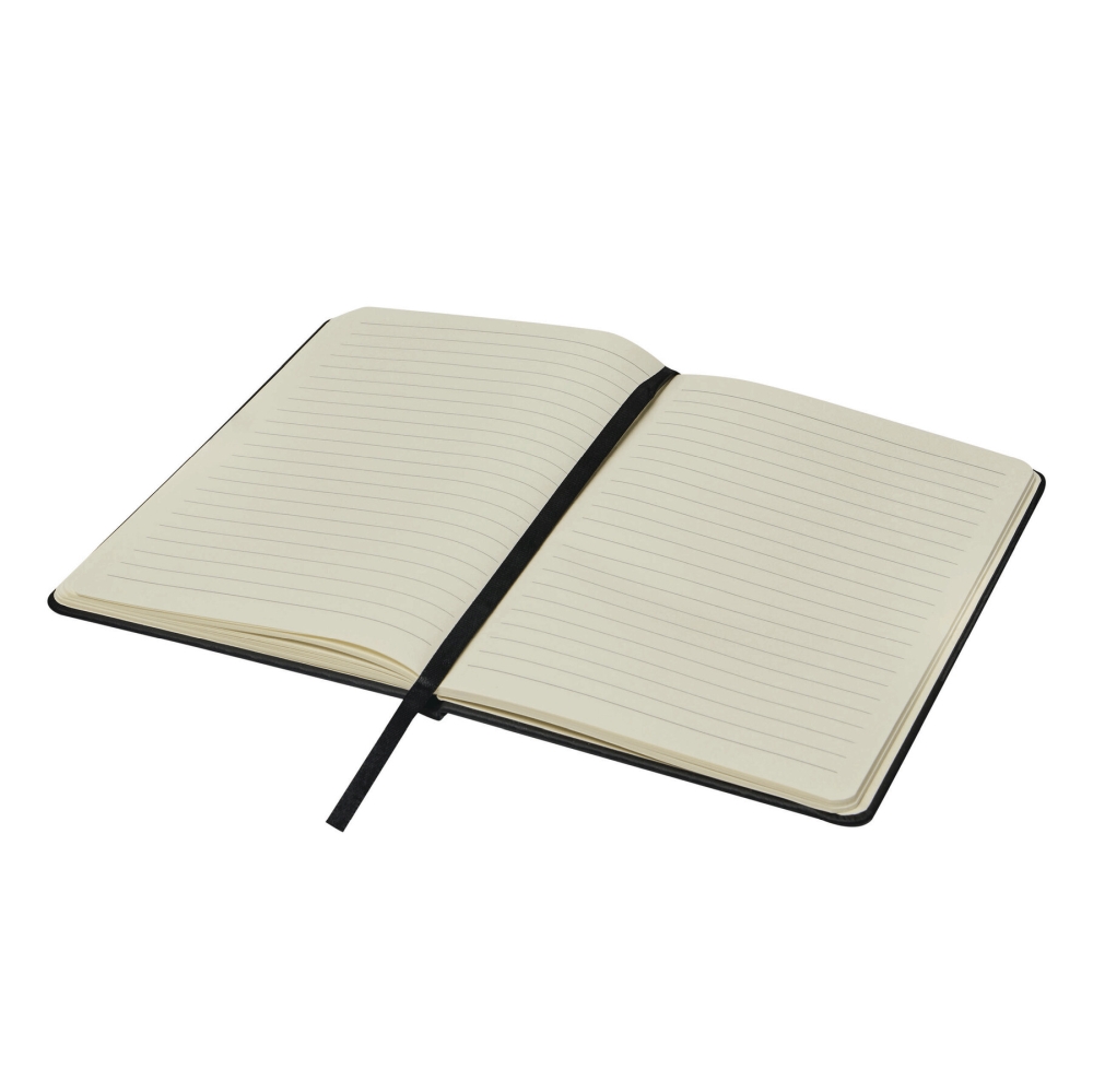 Poznámkový blok A5 se zaoblenými rohy, zavírání gumičkou, s integrovanou záložkou, 80 stran, linkovaný, 70 g/m2. Rozměry: 21,5 x 14,3 x 1,4 cm