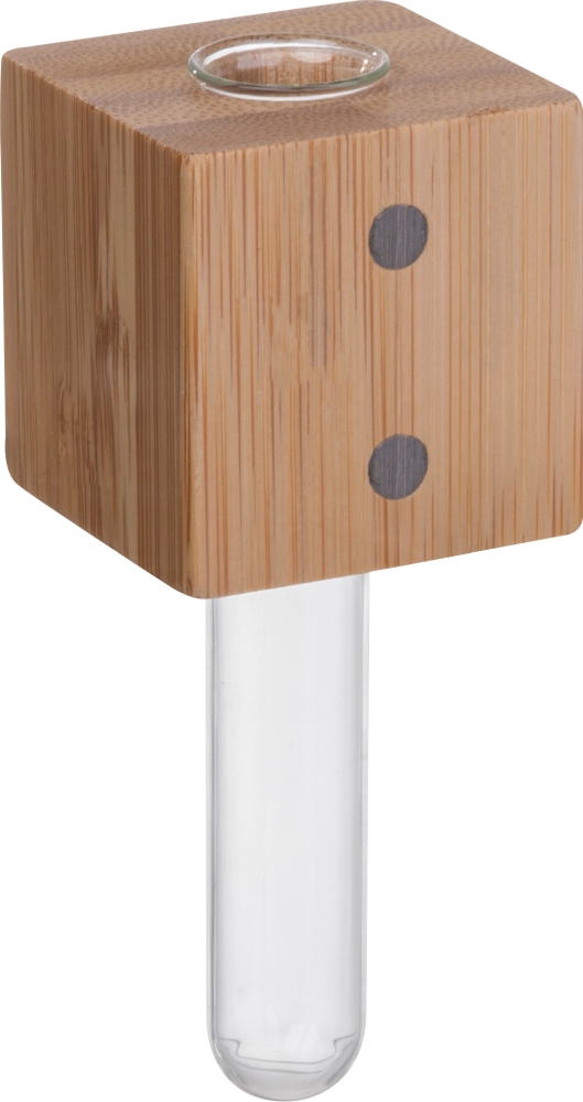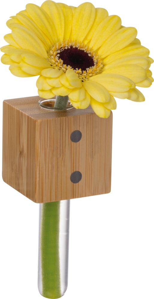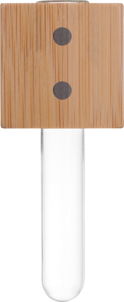 Bambusový magnet na lednici s malou vázičkou z borosilikátového skla. Rozměry: 4 x 4 x 9,5 cm
