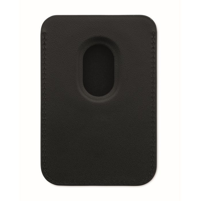 Magnetické pouzdro na kreditní karty z PU kůže (na 3 karty) s funkcí stojánku. Obsahuje přídavný kovový kroužek. Rozměry: 6.5 x 9.5 x 0.8 cm