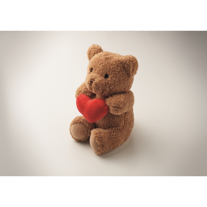 Plyšový medvídek z polyesteru s červeným srdíčkem. Vyšívané oči, nos a pusa. Rozměry: 23 cm
