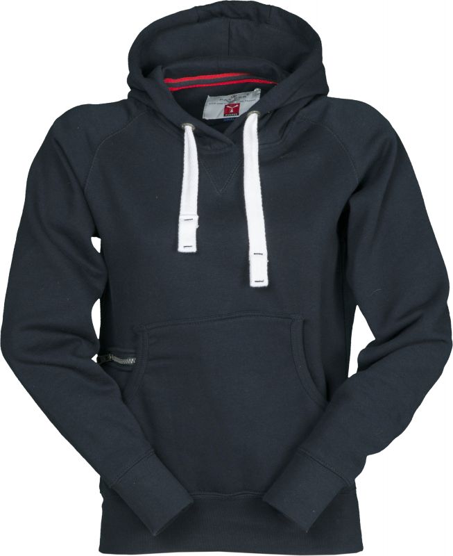 Dámská vyštíhlená mikina s kapucí s dvojitým prošitím, bílá stahovací šňůrka se sladěným prošitím a s kovovými kroužky, raglánové rukávy, V-prošívání pod krkem, klokaní kapsa, kapsička na zip, manžety a pas s elastickým žebrováním, zesílené švy. Gramáž 300g/m2. Materilál 70% bavlna, 30% polyester.