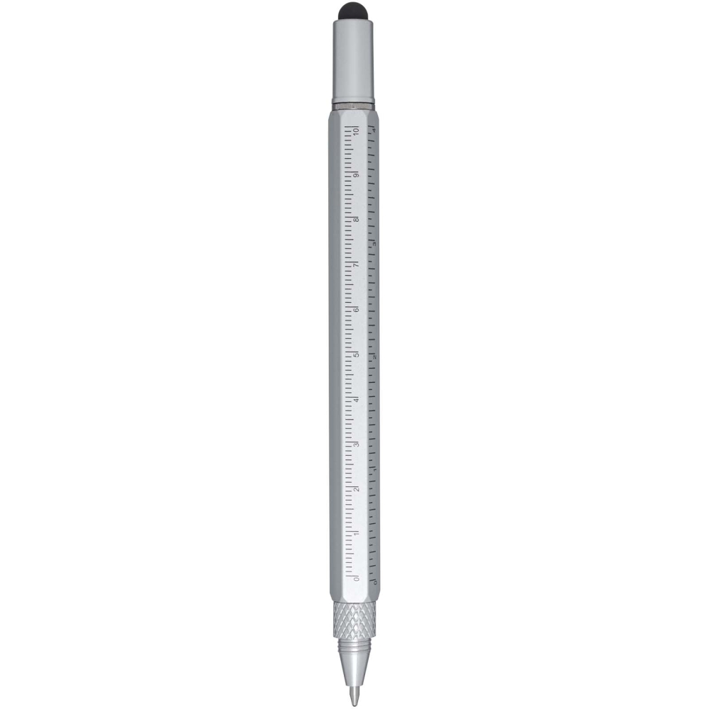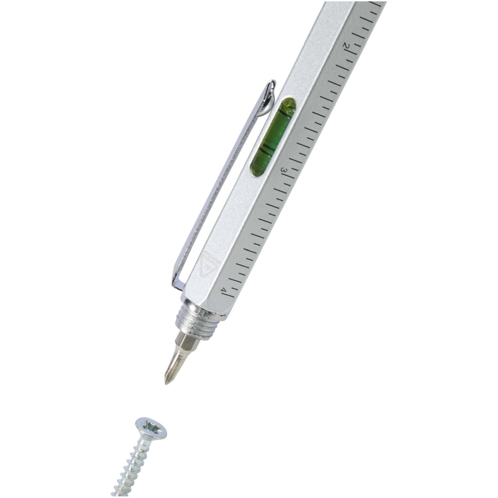 Hliníková multifunkční propiska je částečně vyrobena z recyklovaných materiálů a je vybavena oboustranným pravítkem, páčkou, šroubovákem, pomůckou pro měření úhlu sklonu a černým stylusem z gumy. Tělo je vyrobeno z recyklovaného hliníku se stříbrným nástřikem. Spona je vyrobena ze železa. Šroubovák je vyrobený z oceli. Horní část a špička jsou vyrobeny z materiálu RABS. Barva inkoustu: Černá. Délka psaní: 400 metrů. Rozměr hrotu: 1,0 mm. Rozměry: 15,3 x O 1 cm