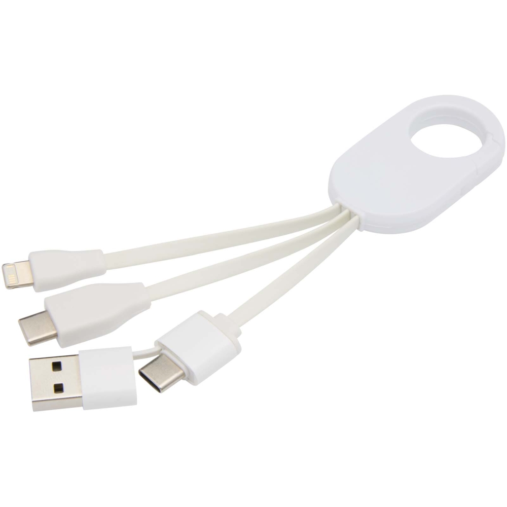 Nabíjecí kabel 4 v 1 vyrobený z recyklovaného plastu se vstupními konektory USB-A a USB-C a kombinovanými výstupy USB-C a Lightning/Micro, které umožňují nabíjet většinu chytrých telefonů, fotoaparátů, powerbank a sluchátek. Vestavěná karabina umožňuje snadné připevnění k tašce nebo klíčence, takže budete vždy připraveni zapnout svá zařízení, ať jste kdekoliv. Rozměry: 14 x 3 cm