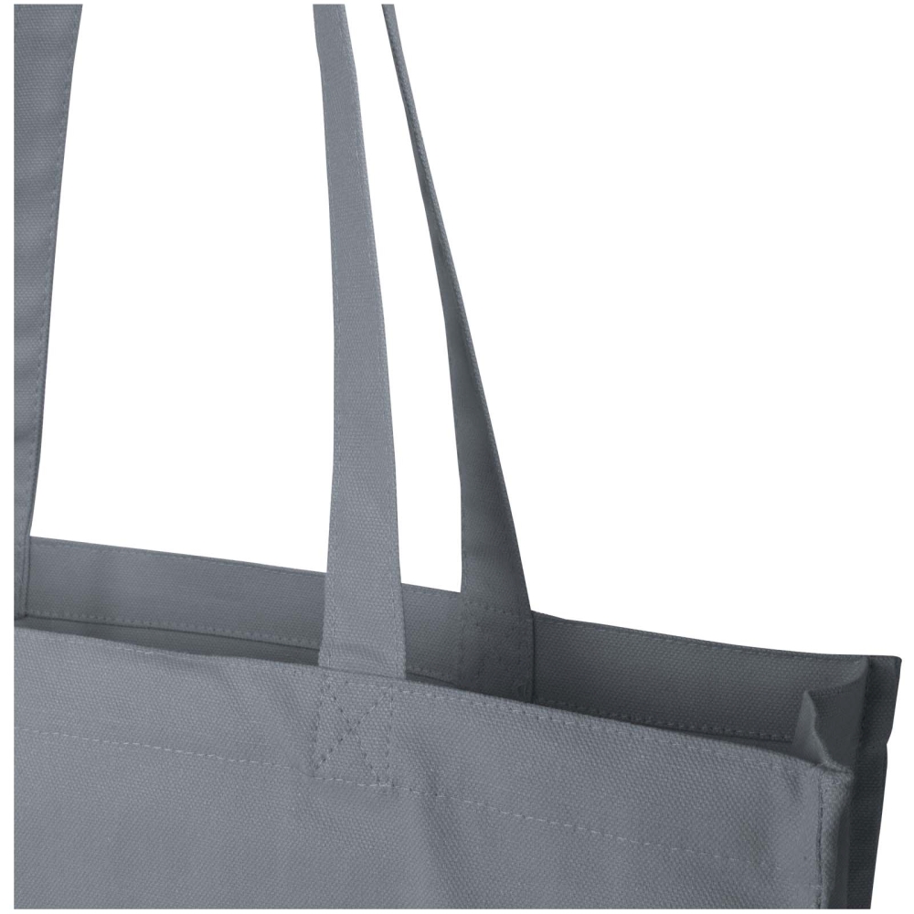Nákupní taška s klínem vyrobená ze 100% recyklované bavlny s certifikací GRS o gramáži 270 g/m2 zajišťuje zodpovědnější a odolnější volbu pro vaše každodenní potřeby. S kapacitou až 14 litrů a 30 cm dlouhými uchy je ideální pro snadné přenášení potravin, knih nebo každodenních nezbytností. Rozměry: 38 x 42 x 9 cm