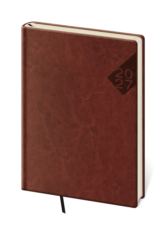 Jde o vysoce kvalitní, na dotek příjemnou koženku, jež dokonale imituje kůži. Jedná se o lesklý materiál, do kterého se výborně razí bez fólie. Diář obsahuje: osobní údaje, plánovač dovolené (měsíční přehled), plánovací kalendář, telefonní předvolby, státní svátky České a Slovenské republiky, mezinárodní svátky, roční výhled, týdenní layout, adresář, mapa Evropy a České a Slovenské republiky. Rozměry: 14,5 x 20,5 cm. Minimální odběr 5 ks. Množství pak dále zvyšovat jen po 5 ks, tedy 5, 10, 15, 20 ks atd.