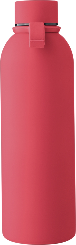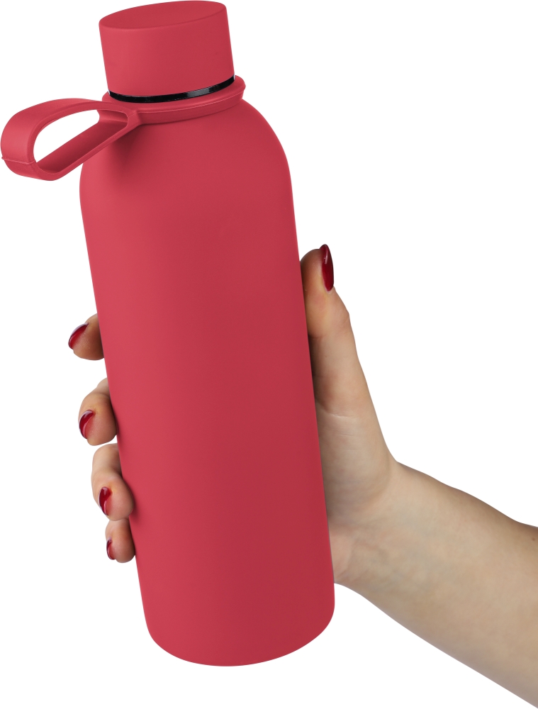 Vakuová láhev na pití z recyklované nerezové oceli s dvojitou stěnou (500 ml) s vnitřní a vnější stranou z nerezové oceli. S pogumovaným povrchem pro měkký pocit. Šroubovací víčko z PP s kovovými detaily a silikonovým poutkem na nošení. Na těle je vyryté recyklované logo. Jednotlivě baleno v hnědé kartonové krabici. Rozměry: 7,3 x 23 cm.