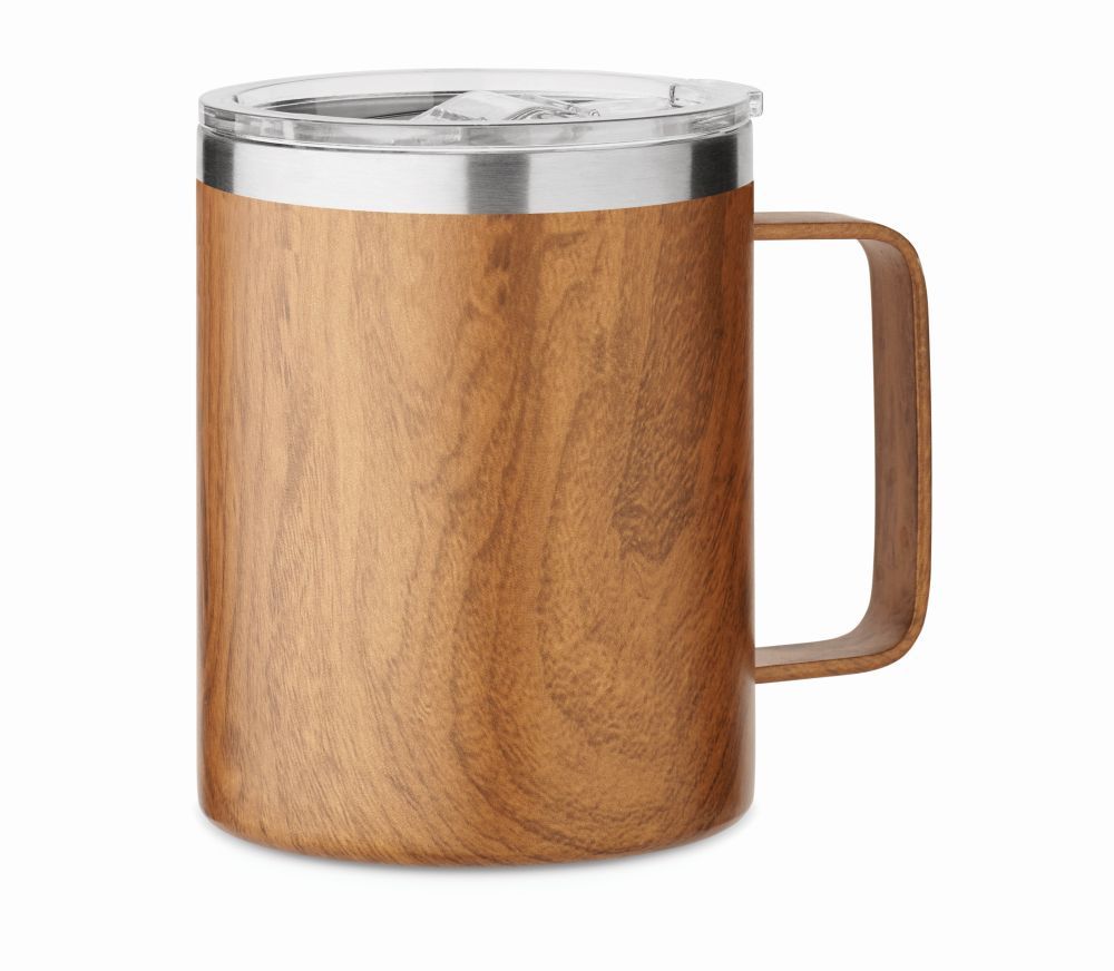 Dvoustěnný hrnek z recyklované nerezové oceli (90 % recyklované nerezové oceli a 10 % nerezové oceli) s dřevěným vzhledem a víčkem s posuvným zavíráním. Objem: 300 ml. Rozměry: 11x11cm