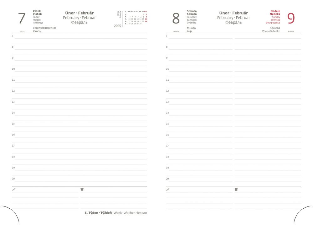 Povrch diáře je zhotoven z univerzálního materiálu na bázi zušlechtěného papíru, který díky své jemné struktuře získává vzhled koženky. Doporučujeme ražbu přes fólii, případně potisk povrchu sítotiskem. Diář obsahuje: osobní údaje, plánovač dovolené (měsíční přehled), plánovací kalendář, telefonní předvolby, státní svátky České a Slovenské republiky, mezinárodní svátky, roční výhled, denní layout, adresář, mapa Evropy a České a Slovenské republiky. Rozměry: 14,5 x 20,5 cm.