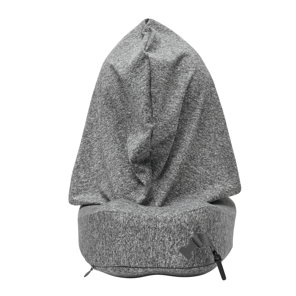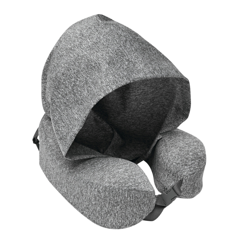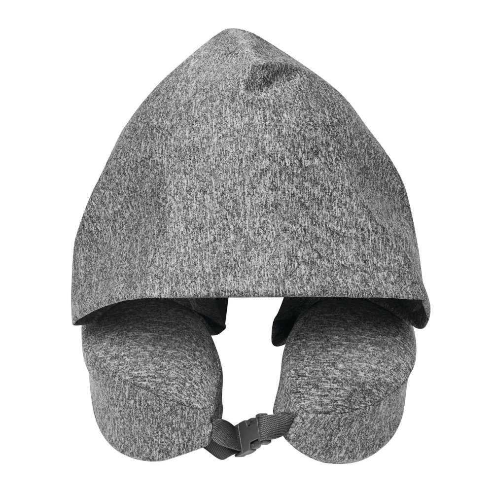 Krční polštář z paměťové pěny s integrovanou kapucí pro zakrytí hlavy a obličeje, s nastavitelným zapínáním na druk, odnímatelný a pratelný žerzejový potah, vyplněný paměťovou pěnou pro optimální pohodlí, poutko s malou karabinou pro zavěšení nebo připevnění během přepravy (karabina NENÍ vhodná pro lezení), krční polštář lze srolovat a zavřít na druk pro úsporu místa. Rozměry: 28 x 22 x 10 cm