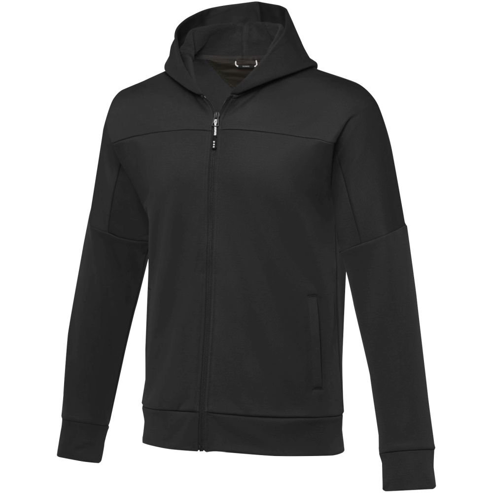 Pánská celopropínací pletená bunda s kapucí, značka Elevate. Přední kapsy. Kartáčované na vnitřní straně. Značkové závěsné poutko. Saténový nákrčník. Vnitřní port na sluchátka s průtahem na kabel. Potisk štítku technologií heat transfer pro větší pohodlí. Úplet 70% polyester, 30% Sorona®, 245 g/m2.
