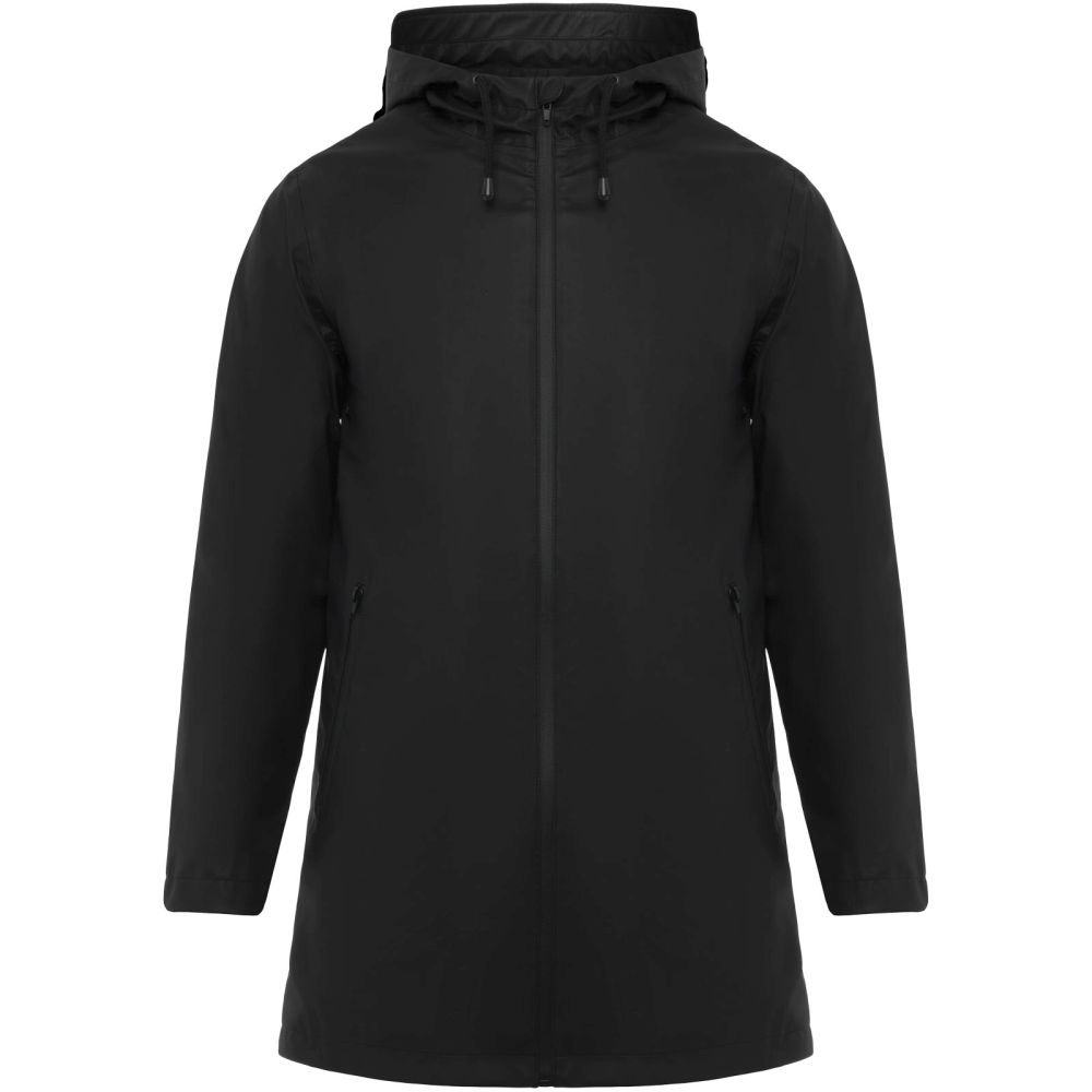 Nepromokavá pláštěnka. Kapuce s kšiltem. Zateplené zipy a švy. Kontrastní detaily v černé barvě. Dvě boční kapsy na zip. Rozparky na zadním lemu. Odnímatelný štítek. Nepromokavá. Modelka měří 185 cm a má na sobě velikost M.
