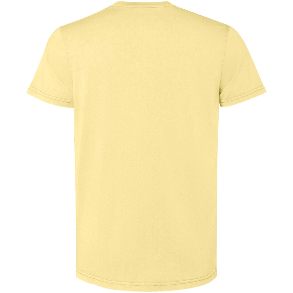 Pánské tričko s krátkým rukávem. Sepraný vzhled. Žebrovaný kulatý výstřih 1 × 1. Krycí steh v tónu látky s uhlazenou povrchovou úpravou.